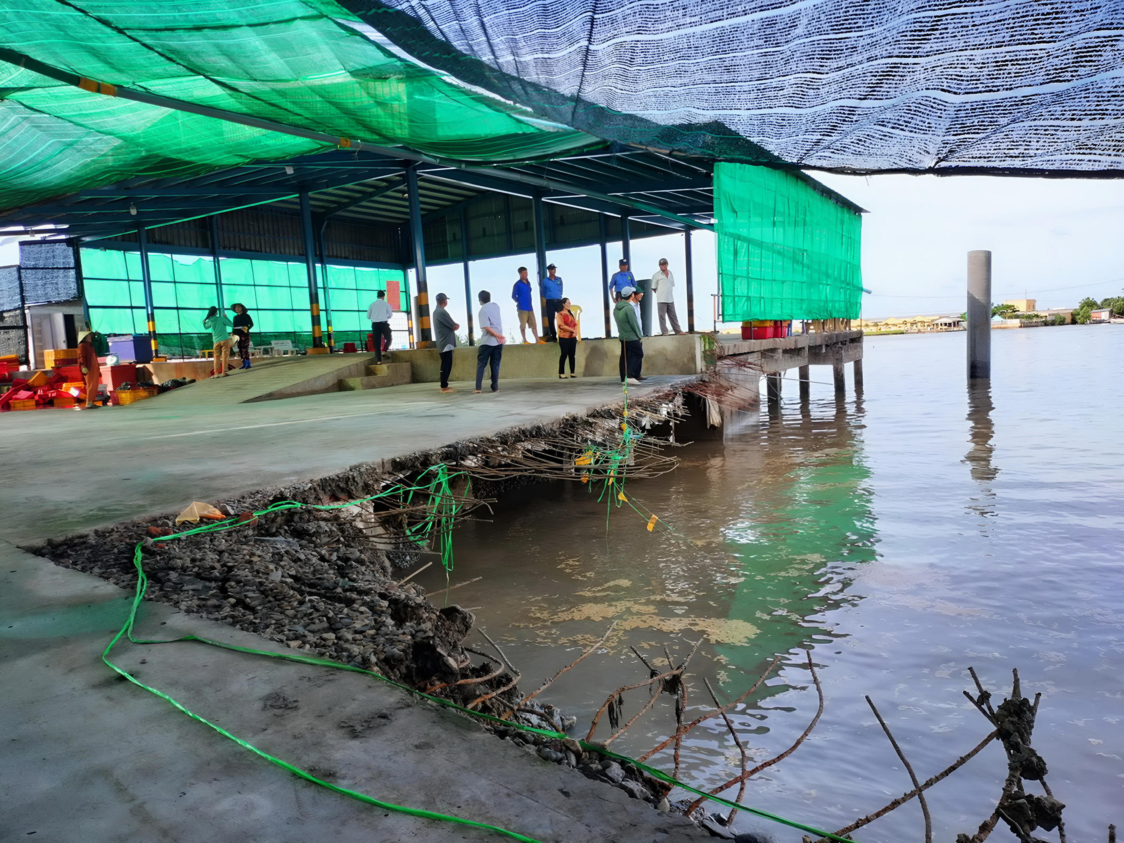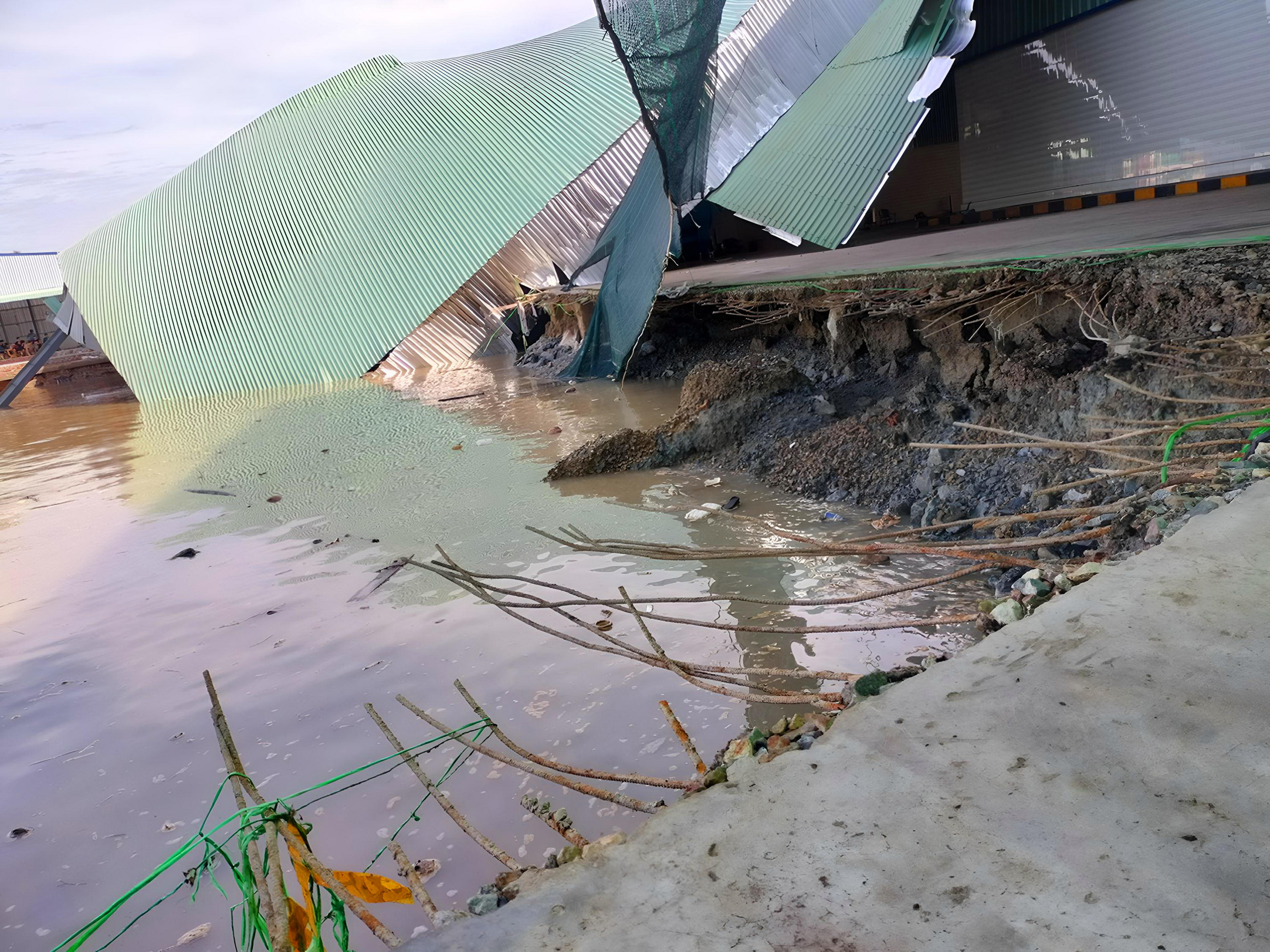 Đoạn sạt lở dài 59 mét, chiều ngang 20 mét, tổng diện tích bị sạt lở khoảng 1.180m2, trên diện tích nhà xưởng xây dựng tiền chế (mái tol lạnh, khung sắt mạ kẽm…); 1 hồ xử lý nước thải (xây dựng bằng bê tông, cốt thép) cùng toàn bộ hàng rào xây dựng bằng bê tông sạt lở hoàn toàn. Ước tổng thiệt hại về tài sản trên 2 tỷ đồng.