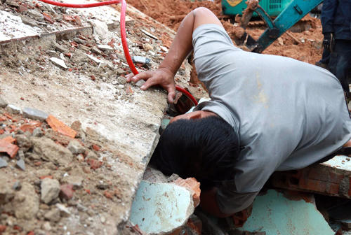 Vừa đi làm về nhà, ông Phạm Công Dũng (46 tuổi) xông vào đống đổ nát cùng lực lượng cứu hộ tìm vợ con.
