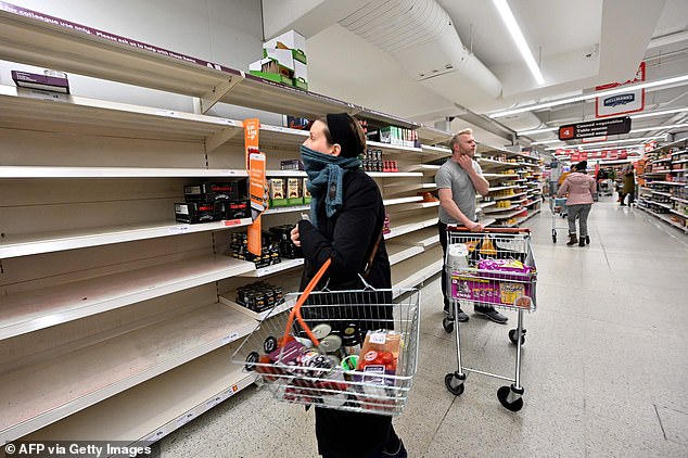 Những kệ hàng trống trơn ở một siêu thị London tháng 3/2020. (Ảnh: AFP) |
