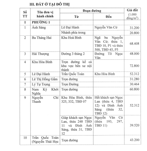 Cụ thể, theo bảng giá đất mới, tại TP Đà Lạt, giá đất nông nghiệp cao nhất 1,2 triệu đồng/m2, đất ở tại nông thôn cao nhất 4,83 triệu đồng/m2, đất ở tại đô thị cao nhất 72,8 triệu đồng/m2 thuộc về khu Hoà Bình (phường 1) và tất cả đường Nguyễn Thị Minh Khai (phường 1), giá đất tại các tuyến đường trung tâm phường 1 dao động từ 30 – 50 triệu đồng/m2, phường 1 Đà Lạt cũng là khu vực có giá đất ở cao nhất Lâm Đồng.