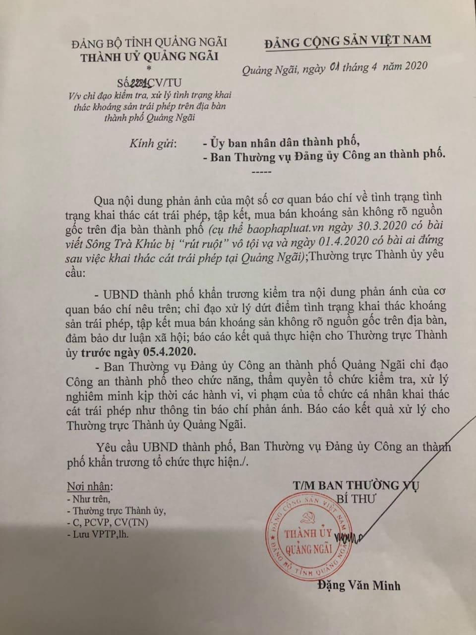 Ngày 10/4, Chủ tịch UBND tỉnh Quảng Ngãi đã ký Công văn hỏa tốc 1513/UBND-NNTN về việc nghiêm túc thực hiện vai trò quản lý nhà nước trong hoạt động khai thác khoáng sản trên địa bàn tỉnh. Cụ thể, sau phản ánh của Báo PLVN, đồng thời thực hiện chỉ đạo của Thường trực Tỉnh ủy tại Công văn số 4340 CV/TU ngày 6/4 về việc khẩn trương báo cáo các nội dung liên quan đến phản ánh của Báo PLVN, Chủ tịch tỉnh chỉ đạo: