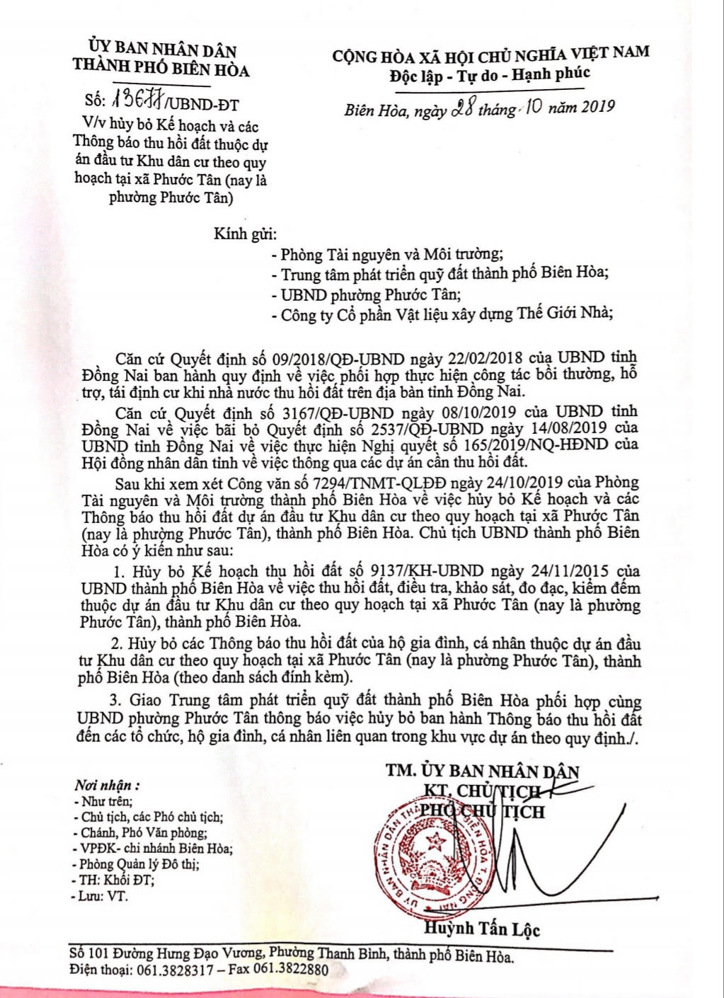 Ngày 28/10/2019, căn cứ vào quyết định trên, UBND TP Biên Hòa chính thức ban hành văn bản hủy bỏ kế hoạch, thông báo thu hồi đất do chính cơ quan này ban hành nhiều năm trước đó. “Hủy bỏ Kế hoạch thu hồi đất số 9137 ngày 24/11/2015 của UBND TP Biên Hòa về việc thu hồi đất, điều tra, khảo sát, đo đạc, kiểm đếm thuộc Dự án Phước Tân (nay là phường Phước Tân). Hủy bỏ các thông báo thu hồi đất của hộ gia đình, cá nhân thuộc Dự án Phước Tân; giao Trung tâm Phát triển quỹ đất Biên Hòa phối hợp UBND phường Phước Tân thông báo việc hủy bỏ ban hành thông báo thu hồi đất đến các tổ chức, hộ gia đình, cá nhân liên quan trong khu vực dự án theo quy định”, thông báo của UBND TP Biên Hòa nêu.