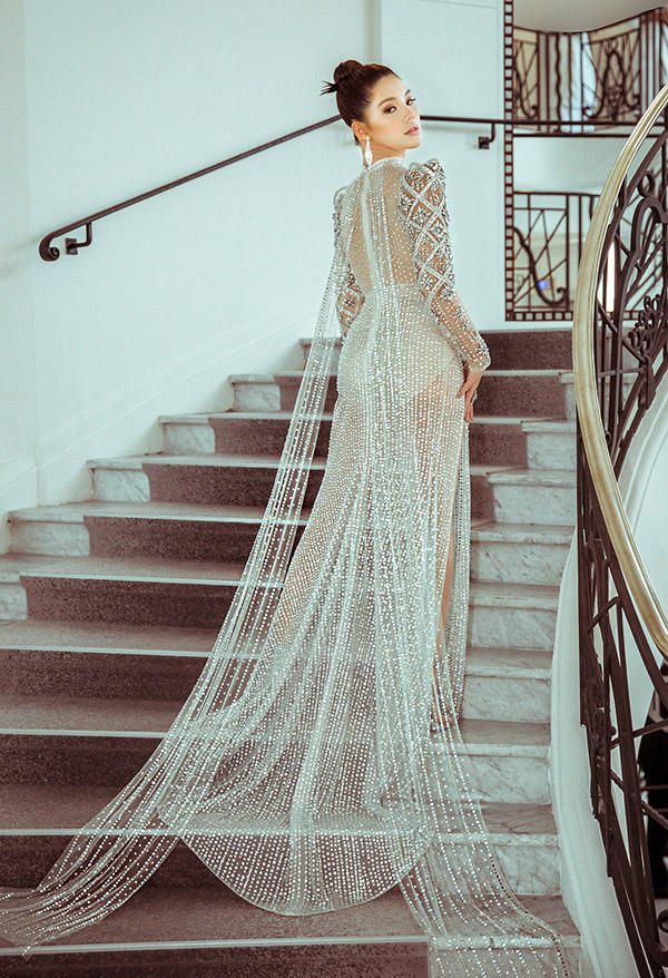 Thiết kế xẻ tới hông, trễ cổ sâu của Huy Trần tôn triệt để vòng một và đôi chân dài của người đẹp Việt kiều Australia. |