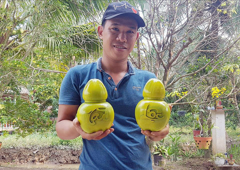Dừa hồ lô chữ nổi của anh Tâm dịp tết này “cháy hàng” (Ảnh: HUỲNH XÂY).