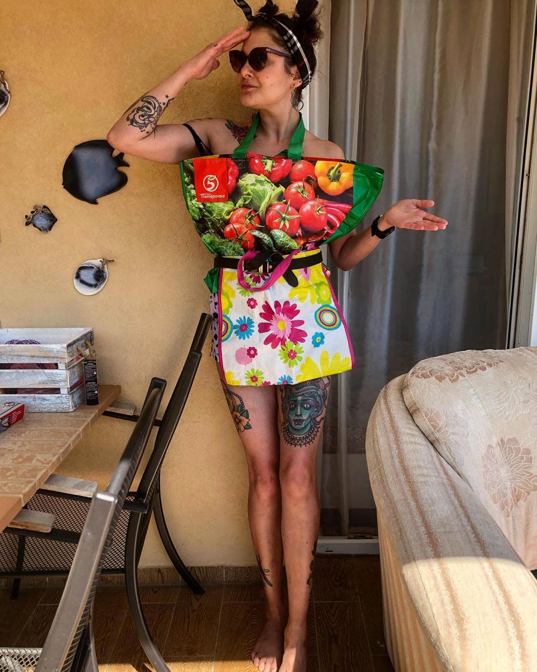 Các từ khóa #apersdresschallenge và #shoppingdresschallenge bắt đầu xuất hiện trên mạng xã hội, khi những người ở nhà buồn chán tìm thứ gì họ có thể biến thành quần áo.