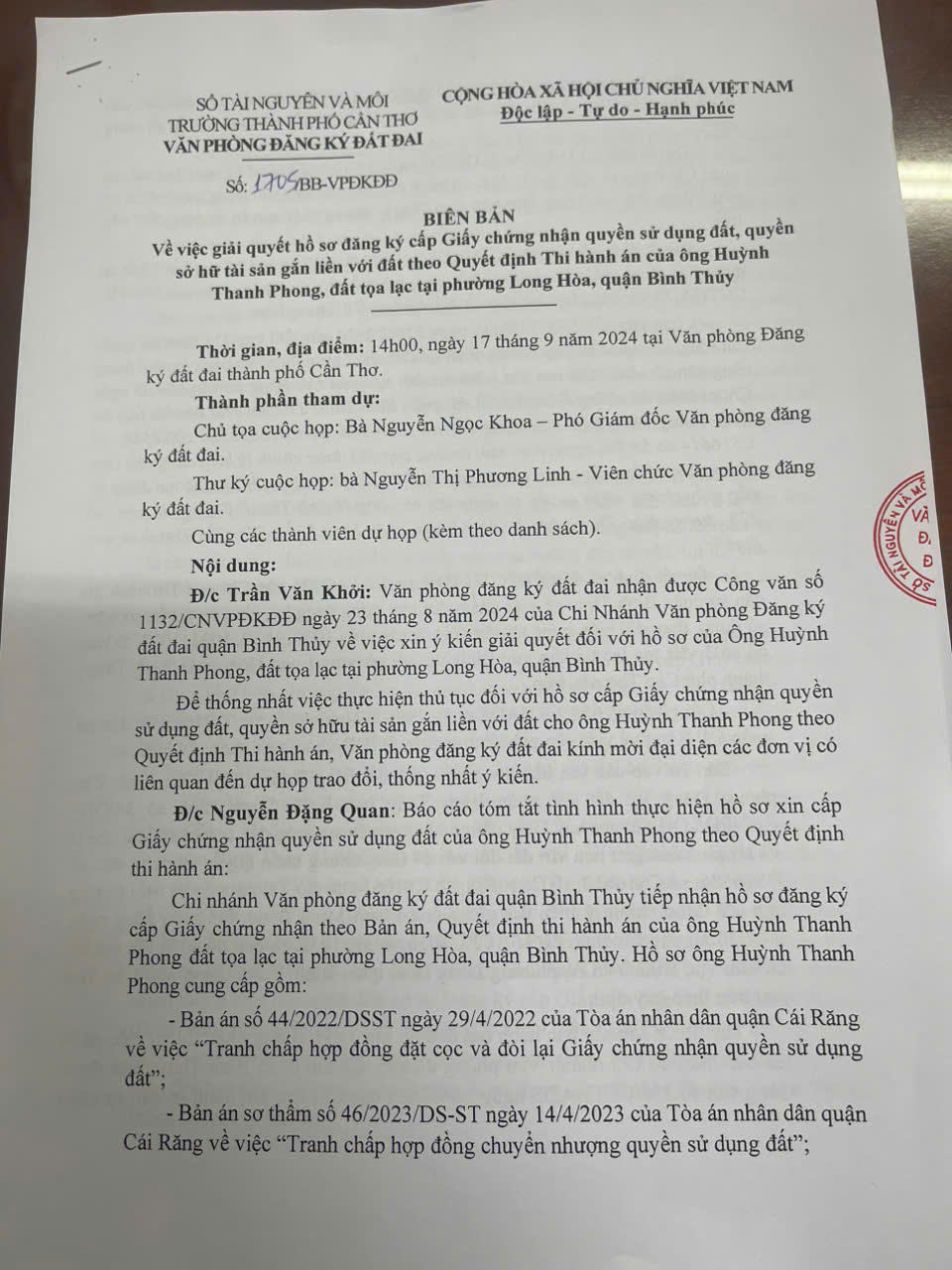 Sự việc trở nên phức tạp khi 4 thửa đất vẫn đứng tên ông Bằng, sổ đỏ do ông Hòa giữ, nhưng bản án lại công nhận quyền sử dụng đất cho ông Phong, khiến quá trình THA phát sinh nhiều vướng mắc. Các cơ quan chức năng tại Cần Thơ cũng đã có cuộc họp thống nhất rằng việc đăng ký cấp sổ đỏ mới chỉ được thực hiện sau khi các nội dung của các bản án liên quan đã được thi hành.