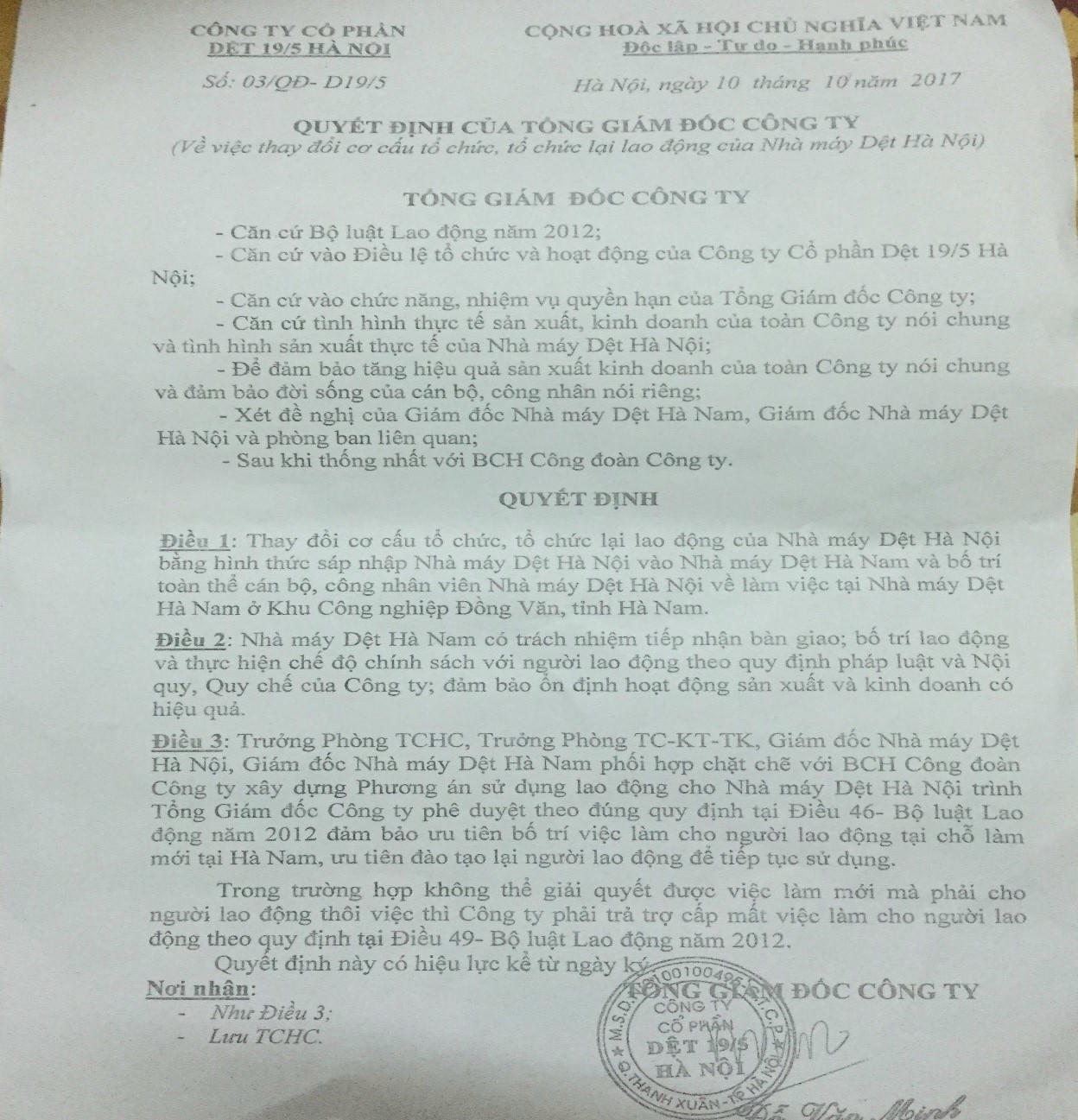 (PLO) - Ban Giám đốc (BGĐ) Công ty Dệt 19/5 Hà Nội đã đưa ra quyết định chính thức về thay đổi cơ cấu tổ chức, tổ chức lại lao động của Nhà máy Dệt Hà Nội bằng hình thức sáp nhập Nhà máy Dệt Hà Nội vào nhà máy Dệt Hà Nam ở KCN Đồng Văn. Điều này có nghĩa sẽ không còn nhà máy Dệt Hà Nội nữa.