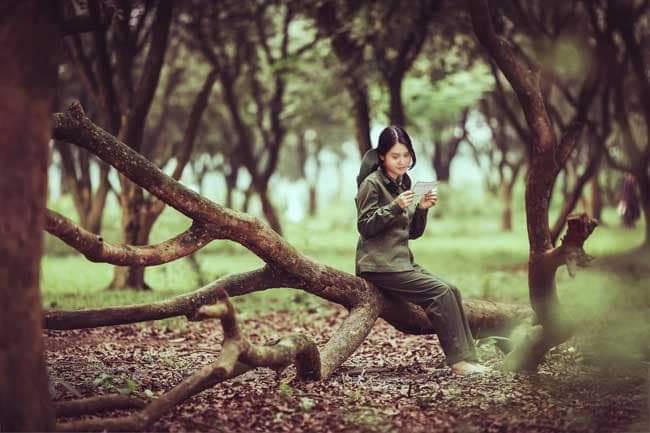 Hình ảnh liệt sĩ Võ Thị Hà ngồi đọc thư, qua phục dựng sử dụng công nghệ AI. |