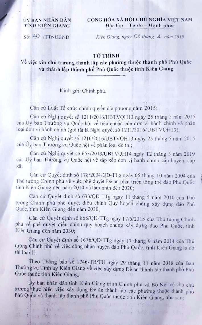 (PLVN) - UBND tỉnh Kiên Giang vừa có Tờ trình xin chủ trương của Chính phủ về việc thành lập các phường và thành phố Phú Quốc trực thuộc tỉnh Kiên Giang. Đề án thành lập thành phố Phú Quốc đã được tỉnh xây dựng xong và được các bộ, ngành và Bộ Nội vụ thông qua vào năm 2014.