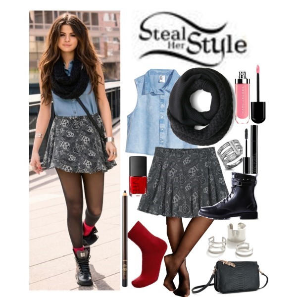Áo denim không tay và chân váy họa tiết tạo vẻ cá tính cho Selena. Cô chọn các phụ kiện đi kèm như giày hầm hố, túi xách, khăn quàng cùng tông màu đen với điểm nhấn là đôi tất đỏ nổi bật. |