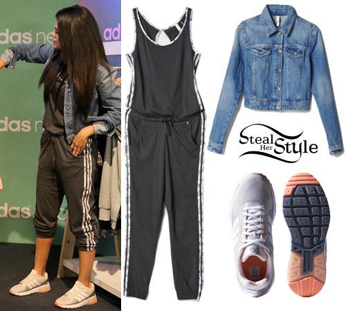Cũng với áo khoác denim, Selena chọn cách phối năng động với bộ jumpsuit không tay màu đen viền sọc trắng cá tính và giày thể thao. |