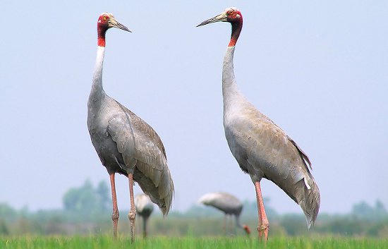 Sếu đầu đỏ được coi là loài chim cao nhất trong số những loài chim biết bay (cao tới 1,6m khi đứng), với bộ lông màu xám, phần đầu màu đỏ đậm, chân đỏ, sải cánh rộng với những điệu múa đôi tuyệt đẹp.