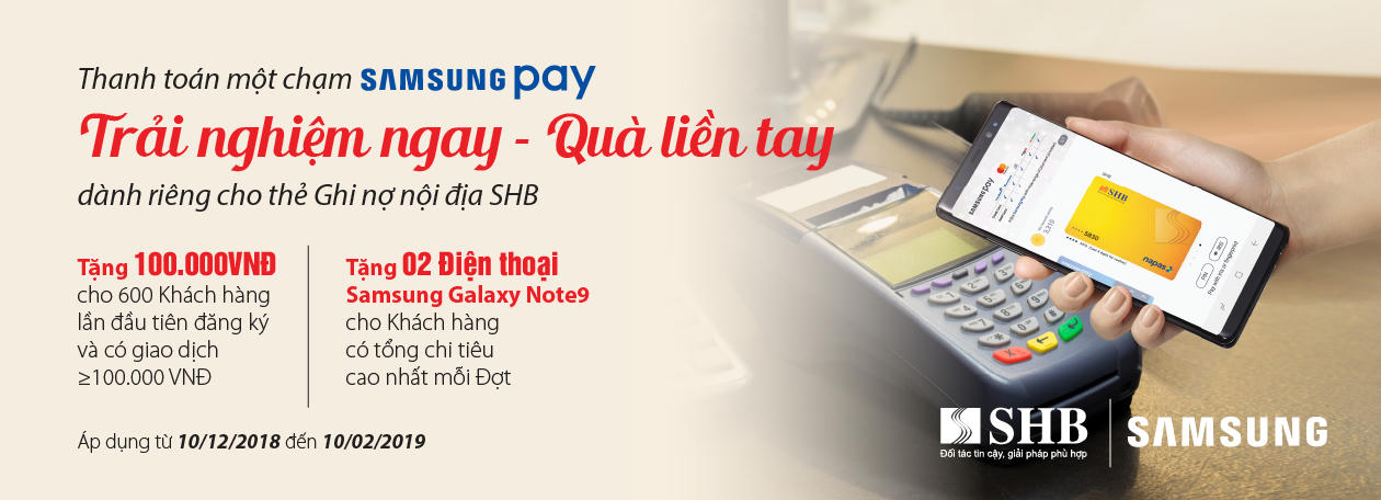 (PLO) - Ngân hàng Sài Gòn – Hà Nội (SHB) và Samsung đang hợp tác triển khai chương trình “Thanh toán một chạm Samsung Pay - Trải nghiệm ngay - Quà liền tay” với nhiều ưu đãi hấp dẫn cho chủ thẻ. Chương trình áp dụng trên toàn quốc từ 10/12/2018 đến 10/02/2019.
