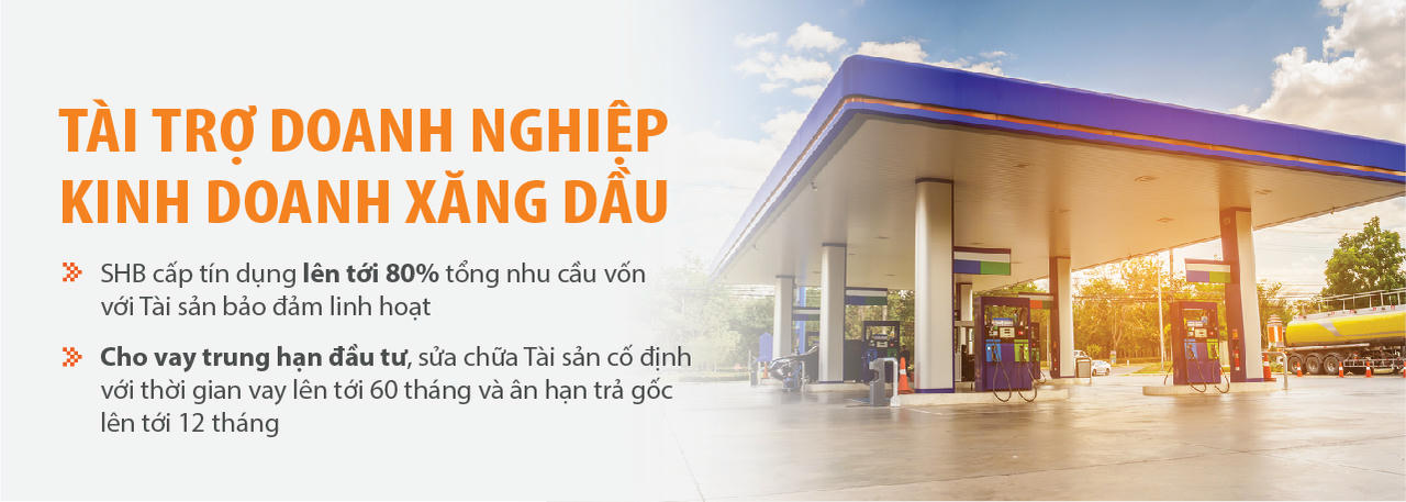 SHB cấp tín dụng lên tới 80% tổng nhu cầu vốn với tài sản đảm bảo linh hoạt, đa dạng với khách hàng hoạt động trong lĩnh vực kinh doanh xăng dầu bao gồm: thương nhân đầu mối, thương nhân phân phối, tổng đại lý, đại lý và thương nhân bán lẻ xăng dầu. Đặc biệt, SHB cho vay trung hạn đầu tư, sửa chữa tài sản cố định với thời gian vay lên tới 60 tháng và ân hạn trả gốc lên tới 12 tháng. Các thủ tục quy trình tối giản với lãi suất cho vay hợp lý và cạnh tranh theo các gói ưu đãi của SHB.
