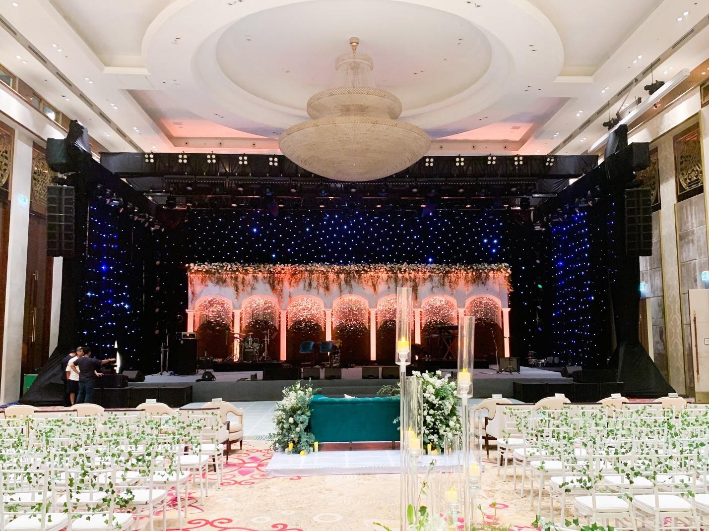 | Không gian đại sảnh Grand Ballroom nơi tổ chức nghi lễ Sangeet của cô dâu và chú rể |