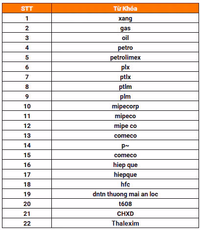 Danh sách từ khóa xác định tài khoản thanh toán xăng dầu hợp lệ theo thể lệ chương trình:
