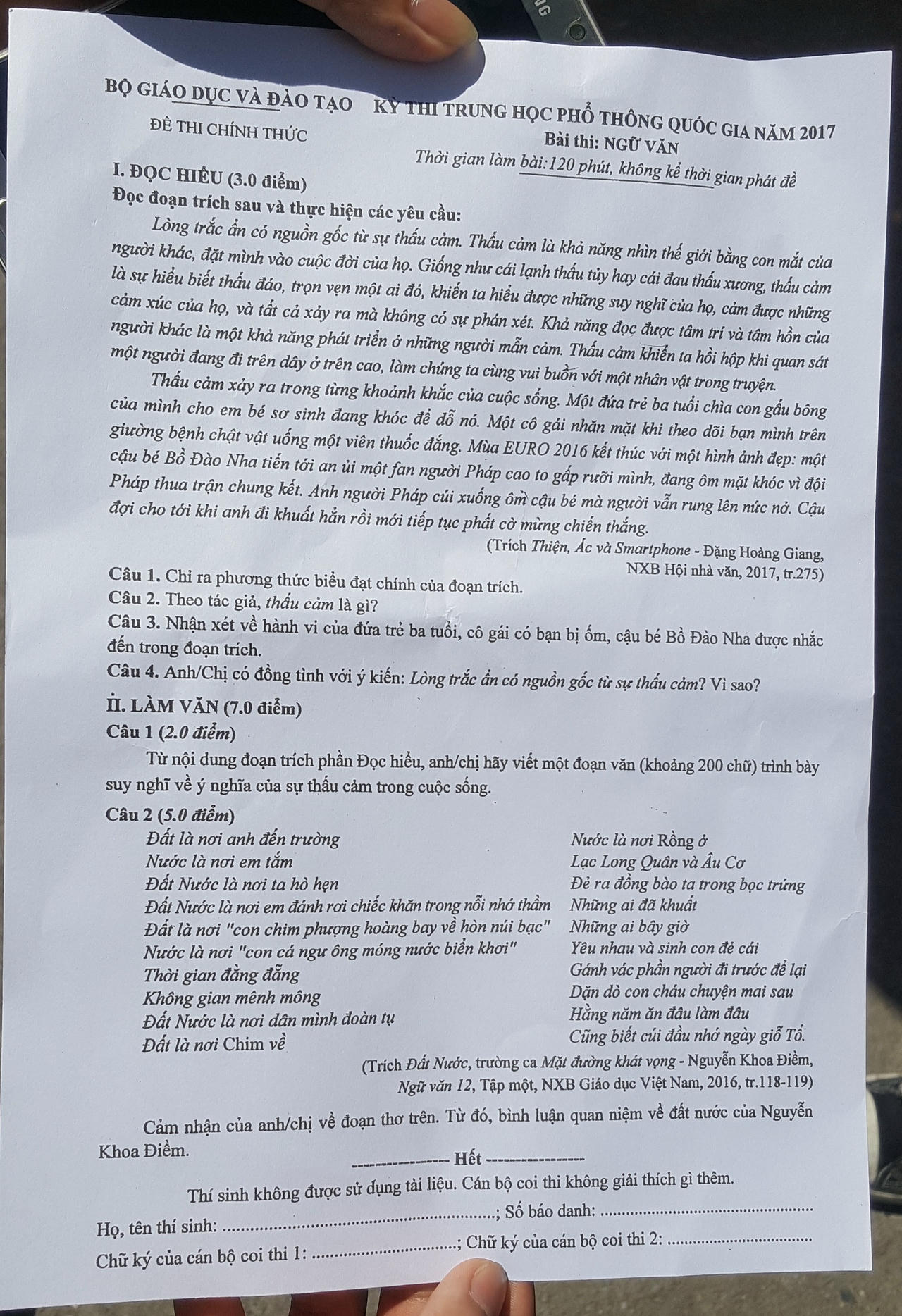 Theo đánh giá của nhiều thí sinh, đề thi năm nay vừa sức, trong chương trình. Hầu hết các thí sinh đều tỏ ra hào hứng với đề Ngữ văn năm nay, nhất là phần làm văn với việc trình bày suy nghĩ về ý nghĩa của sự thấu cảm trong cuộc sống và viết cảm nhận, bình luận về quan niệm về đất nước.