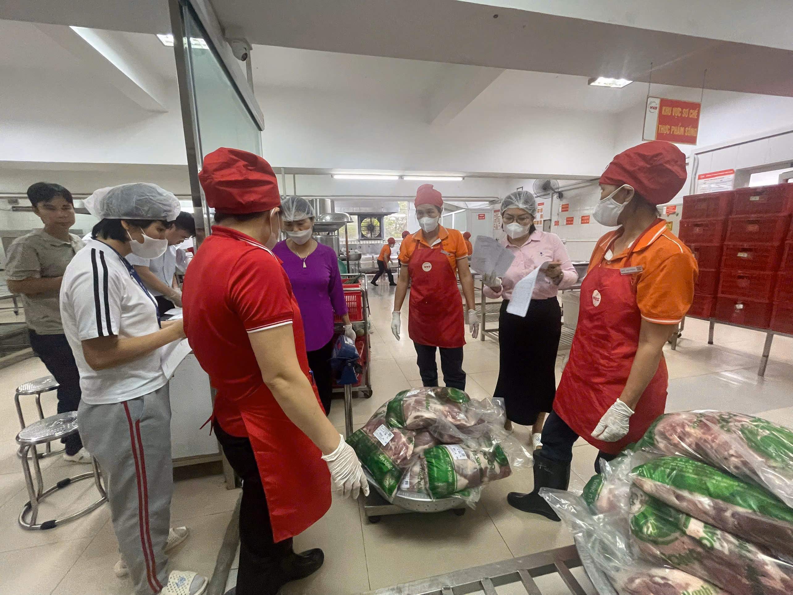 Cuộc kiểm tra diễn ra ngay từ khâu giao nhận thực phẩm đầu vào, từng lô hàng, nguyên liệu, giấy tờ liên quan đến nguồn gốc, bảo quản, nhãn nhận diện sản phẩm được rà soát trực tiếp trước khi đưa vào bếp.