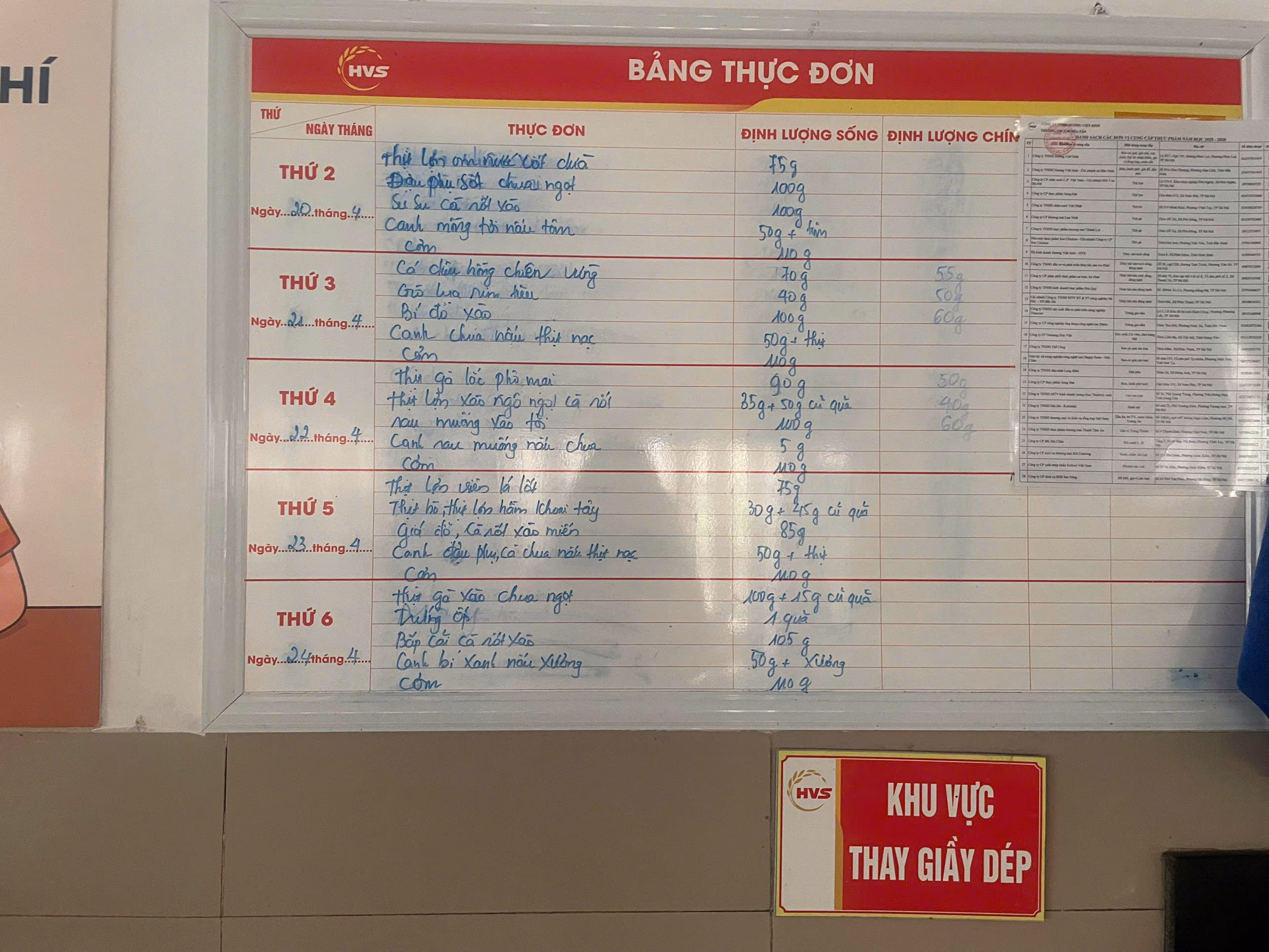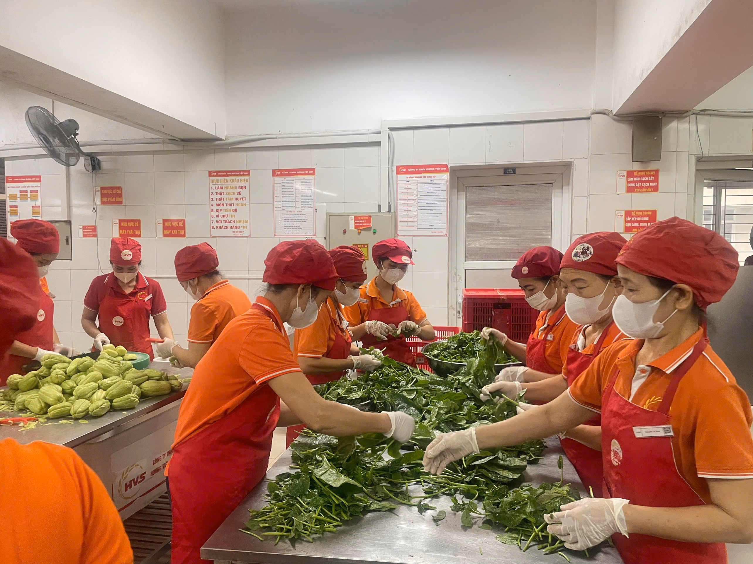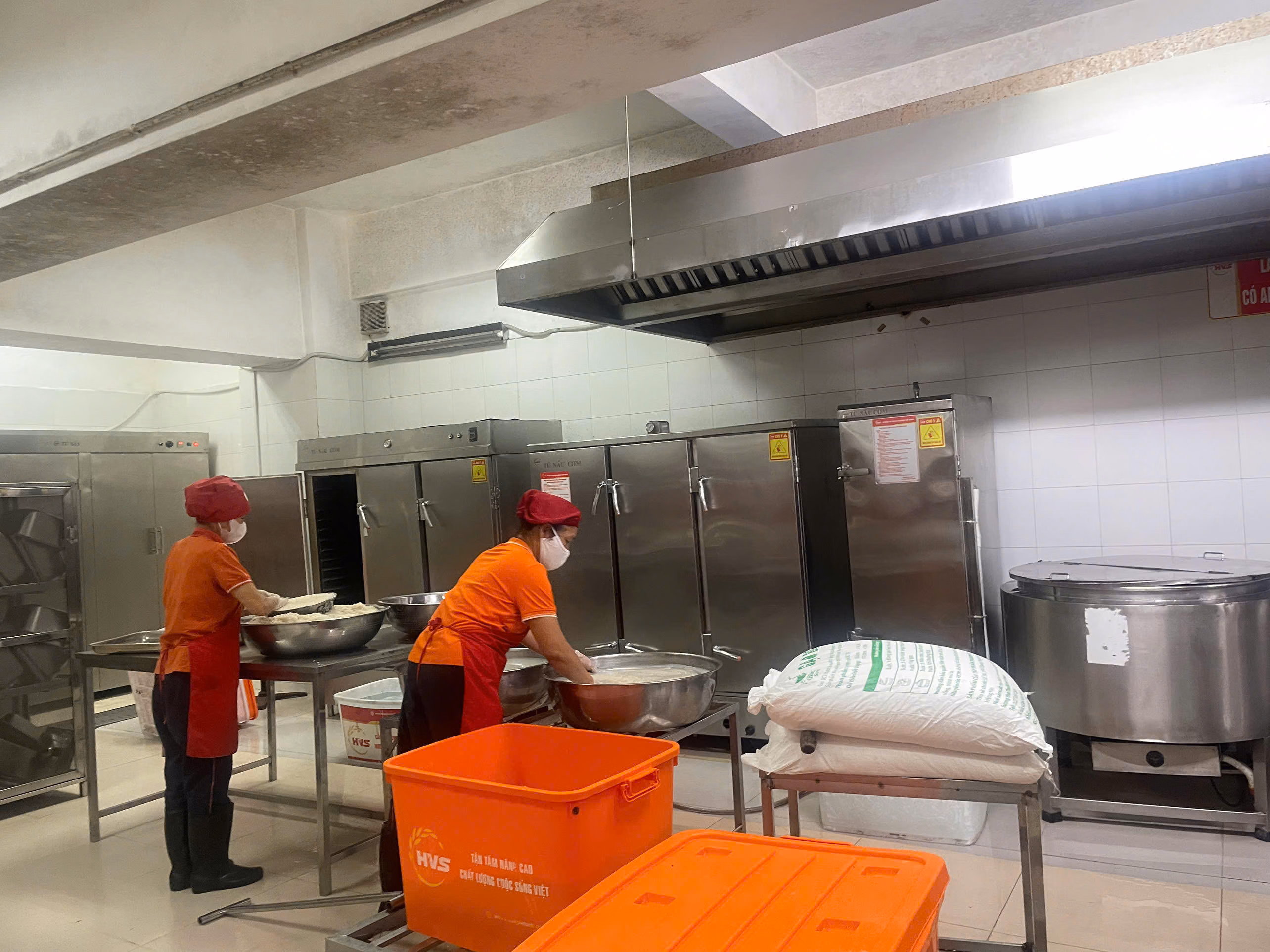 Khu vực bếp ăn, bàn thao tác, dụng cụ chế biến, khay ăn, bát, đũa được bố trí, vệ sinh sạch sẽ; nguyên liệu thực phẩm được kiểm tra, đối chiếu và sử dụng theo đúng quy trình.