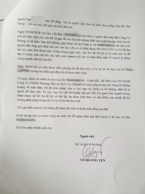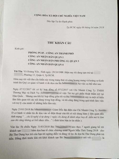 Trong thư khẩn cầu của Võ Hoàng Yến, người đẹp cho biết có ký hợp đồng với Á khôi này nhưng xảy ra một số hiểu lầm. Khi đang tìm hướng giải quyết thì chân dài bất ngờ nhận được tin nhắn đe doạ từ người này: “Chị là nghệ sĩ tự dưng một ngày chị đi đánh nhạc hay đi diễn mà bị làm sao thì cũng không ai biết được đâu”.