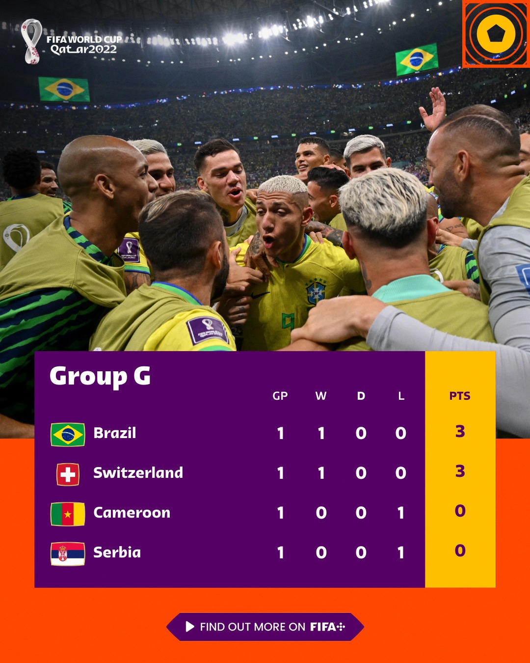 Thắng lợi 2-0 trước Serbia, giống như tỷ số họ đã thắng đối thủ này vào năm 2018, đủ để Brazil có sự khởi đầu suôn sẻ ở World Cup 2022. Sau lượt đấu đầu tiên, họ tạm thời có được ngôi đầu bảng G, đứng Thụy Sỹ.