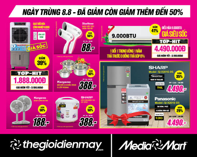 (PLVN) - Ngày 8/8 tới đây, siêu thị điện máy MediaMart sẽ bùng nổ chương trình khuyến mại “Ngày trùng 8.8 – Đã giảm còn giảm thêm đến 50%”, hứa hẹn mang đến cho người dùng cơ hội mua sắm hàng ngàn sản phẩm điện máy với giá sốc không tưởng chỉ từ 88.000đ, 188.000đ, 388.000đ….