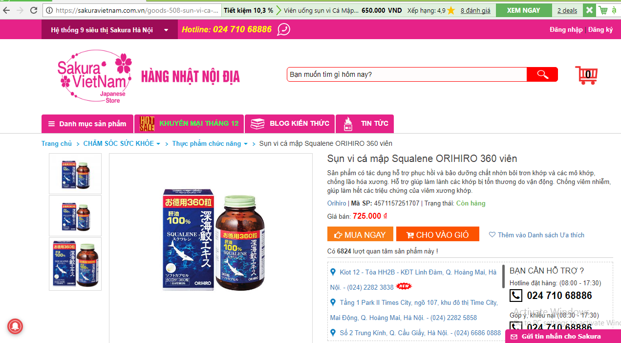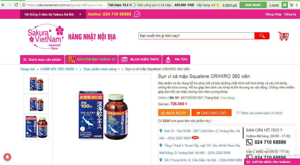 Ngoài ra, hệ thống siêu thị Sakura Việt Nam cũng đang bày bán rất nhiều sản phẩm TPCN với mức giá trên trời. Có thể kể đến một số mặt hàng đang được bày bán với mức giá “cắt cổ” như: dòng Thực phẩm chăm sóc sức khỏe – DHC viên uống với 20 loại khác nhau giá 200.000 – 1 triệu đồng/gói; Dr. Senobiru - thực phẩm bổ sung axit amin hỗ trợ tăng cường trẻ nhỏ (60 gói) giá 5,9 triệu đồng/hộp; Dr. Select – Tinh chất nhau thai 30000 Placenta Drink 30 gói giá 2,3 triệu đồng/hộp; Tảo vàng SPIRULINA loại 2200 viên,...