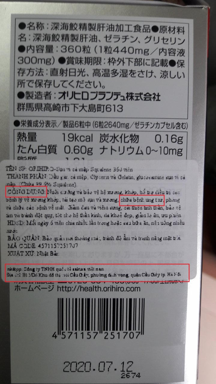 Bên cạnh đó, một dòng sản phẩm nhập khẩu rất khắt khe trong việc phải đảm bảo các điều kiện trước khi đưa ra lưu thông trên thị trường là thực phẩm chức năng (TPCN) cũng rơi vào tình trạng tương tự. Tuy nhiên, một điều hết sức nguy hiểm đó là việc siêu thị Sakura còn “nổ” rằng những sản phẩm TPCN đó có khả năng “chữa bệnh ung thư” (ghi trên tem nhãn phụ TPCN ORIHIRO Sụn vi cá mập Squalone, 360 viên).