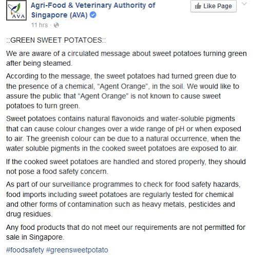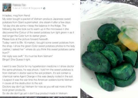 Tuần qua, một tin đồn lan truyền trên Facebook nói rằng khoai lang Nhật trồng ở Việt Nam và được nhập khẩu vào Singapore, đã biến thành màu xanh lá cây sau khi hấp nóng bằng lò vi sóng do để tủ lạnh qua đêm.