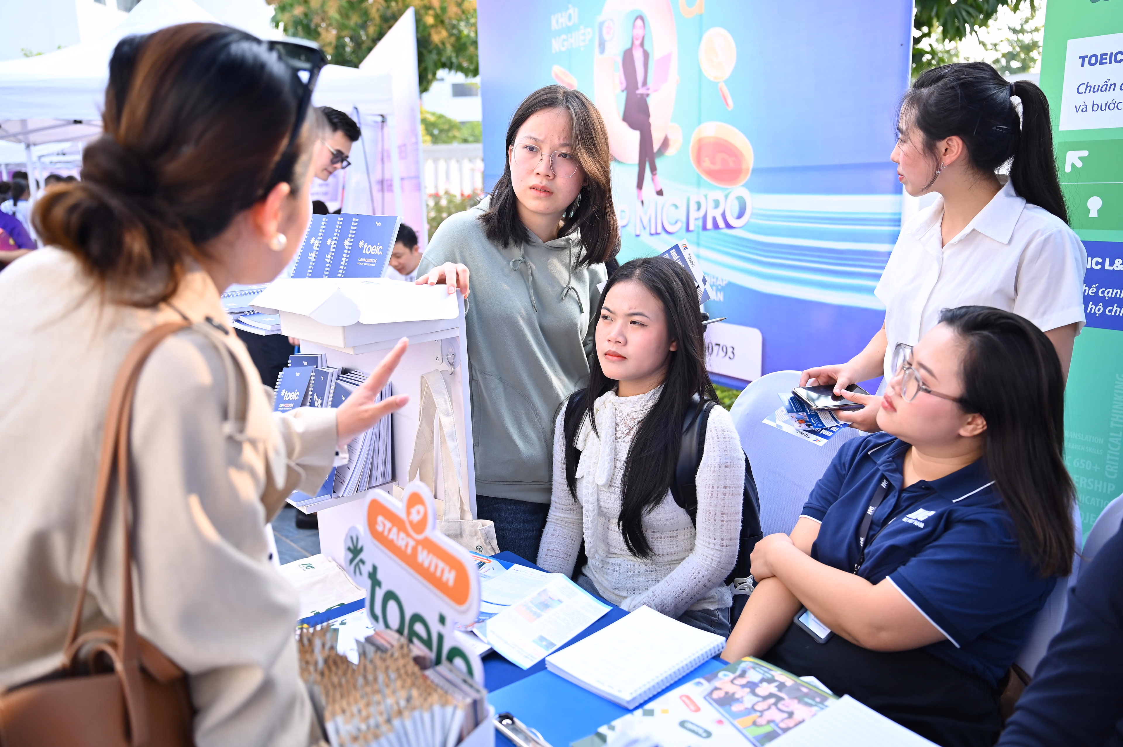 Tại các gian hàng, đại diện doanh nghiệp trực tiếp giới thiệu về môi trường làm việc, nhu cầu tuyển dụng, vị trí thực tập, yêu cầu kỹ năng và lộ trình nghề nghiệp. Không khí trao đổi diễn ra cởi mở, thực chất, giúp sinh viên có cái nhìn rõ nét hơn về thị trường lao động cũng như yêu cầu của nhà tuyển dụng.