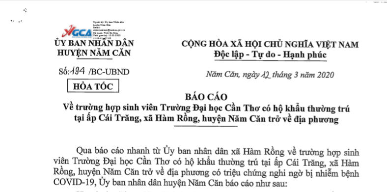 Công văn hỏa tốc của UBND huyện Năm Căn (Cà Mau) về trường hợp sinh viên Trường Đại học Cần Thơ có hộ khẩu thường trú tại ấp Cái Trăng (xã Hàm Rồng, huyện Năm Căn, Cà Mau).