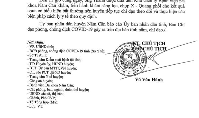 Theo Báo cáo số 76/BCĐ của Ban chỉ đạo Phòng chống dịch Covid-19 UBND tỉnh Cà Mau cũng cho rằng, đối với trường hợp của anh P.V.T “về yếu tố dịch tễ hiện tại không sốt, khai có ho đang theo dõi điều trị cách ly tại Bệnh viện Năm Căn; Trung tâm Kiểm soát bệnh tật liên hệ Viện Pasteur, loại trừ không đủ tiêu chuẩn lấy mẫu theo định nghĩa. Bệnh viện Đa Khoa Năm căn đang tiếp tục theo dõi tình trạng sức khỏe”.