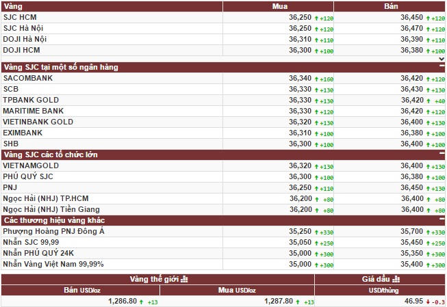 Công ty vàng bạc đá quý Sài Gòn niêm yết giá vàng SJC ở mức 36,26 triệu đồng/lượng (mua vào) và 36,48 triệu đồng/lượng (bán ra), tăng 130 ngàn đồng ở cả 2 chiều mua vào và bán ra so với chiều ngày 16/8.