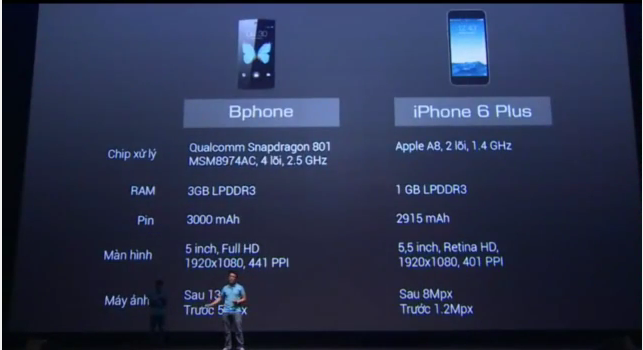 | Bảng so sánh các thông số kỹ thuật của Bphone và iPhone 6 Plus. |