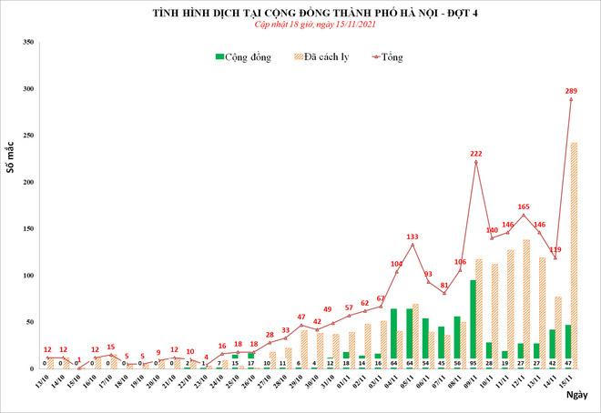 Trung tâm Kiểm soát bệnh tật (CDC) Hà Nội tối 15/11 ghi nhận số ca nhiễm kỷ lục - 289 ca mắc COVID-19, phân bố tại 19/30 quận, huyện. Trong đó, 47 ca cộng đồng, 178 ca trong khu cách ly và 64 ca khu phong tỏa. Đây là lần thứ 2 trong gần một tuần qua, số ca nhiễm của Hà Nội vượt mốc 200. Có những ngày, F0 ngoài cộng đồng nhiều hơn F0 đã được cách ly hay trong khu phong tỏa.