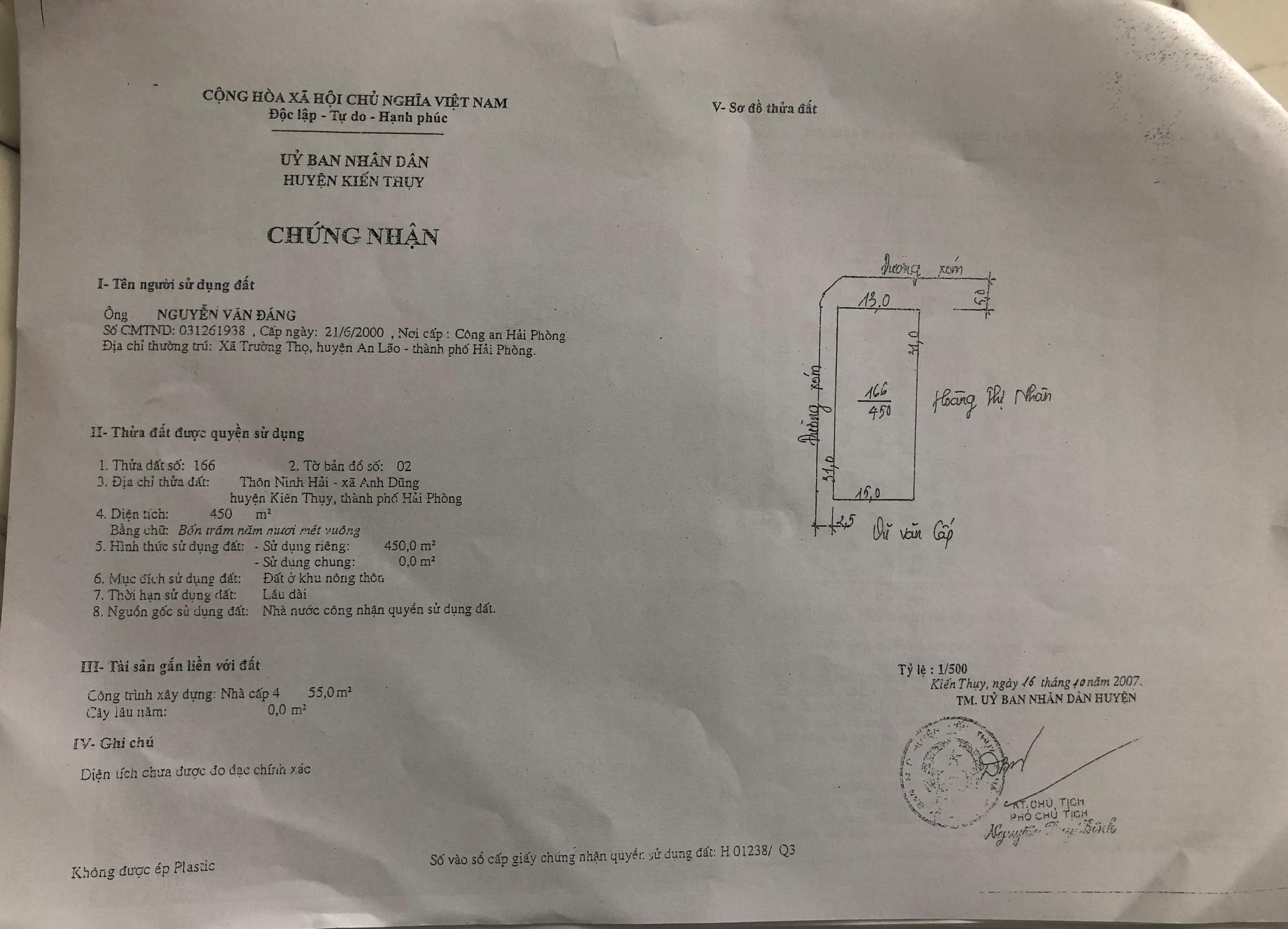 Thửa đất trên được UBND huyện Kiến Thụy cấp Giấy chứng nhận QSDĐ cho ông Nguyễn Văn Đáng số AO 551186, số vào sổ H01238/Q3 ngày 16/10/2007 do Phó chủ tịch UBND huyện Kiến Thụy Nguyễn Duy Bình ký. Nguồn gốc đất thể hiện là đất ở khu vực nông thôn với thời hạn lâu dài. Thời điểm giao dịch, anh Thắng đã thanh toán cho ông Đáng số tiền gần 2,45 tỷ đồng.