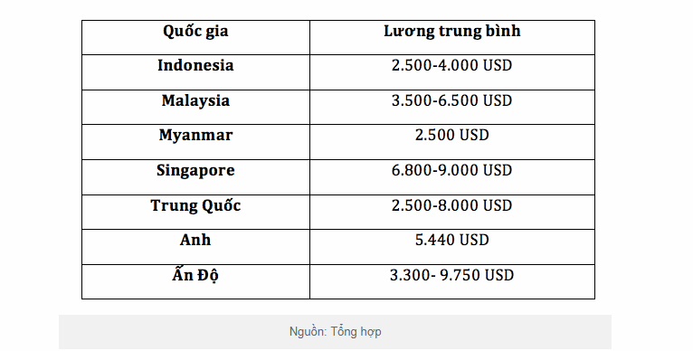 Theo khảo sát từ các trang web thống kê lương phi công thế giới, mức lương của phi công từ cấp cơ phó (thu nhập miễn thuế) của các nước trong khu vực Asean dao động từ 2.500 - 9.750 USD/tháng (khoảng 57 - 224 triệu đồng).