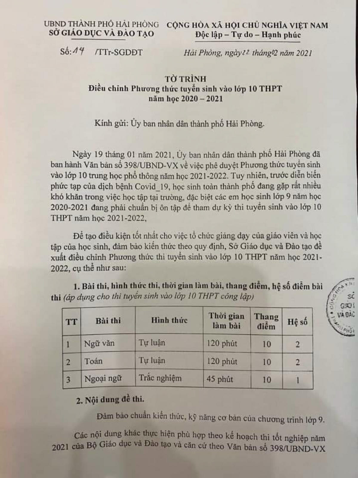 (PLVN) - Sở GD&ĐT Hải Phòng vừa có tờ trình UBND thành phố về việc điều chỉnh phương thức tuyển sinh vào lớp 10 THPT năm học 2021-2022.