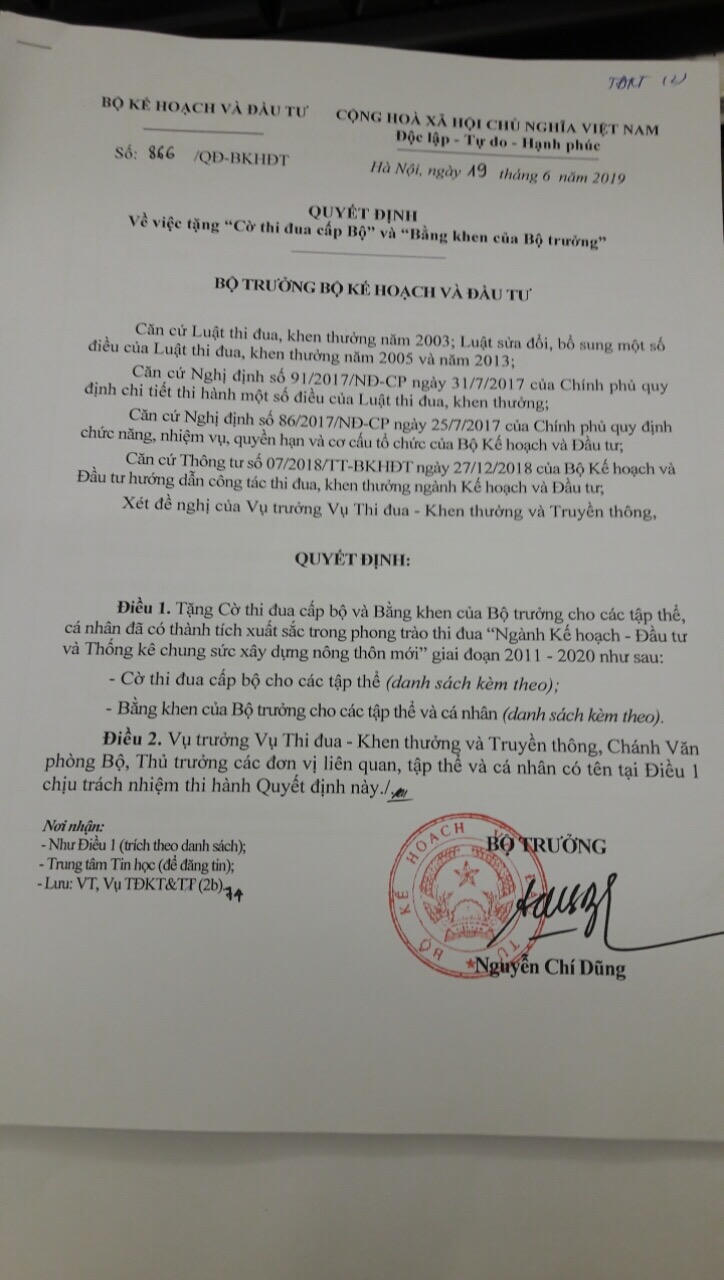 Sự kiện diễn ra trong Hội nghị đánh giá tình hình thực hiện cơ chế phân bổ và sử dụng nguồn vốn ngân sách phục vụ Chương trình mục tiêu quốc gia xây dựng nông thôn mới” và “Tổng kết phong trào thi đua ngành Kế hoạch, Đầu tư và Thống kê chung sức xây dựng nông thôn mới” giai đoạn 2011 – 2020” được Bộ Kế hoạch và Đầu tư tổ chức tại thành phố Bến Tre (tỉnh Bến Tre) trong 2 ngày 24, 25/6.