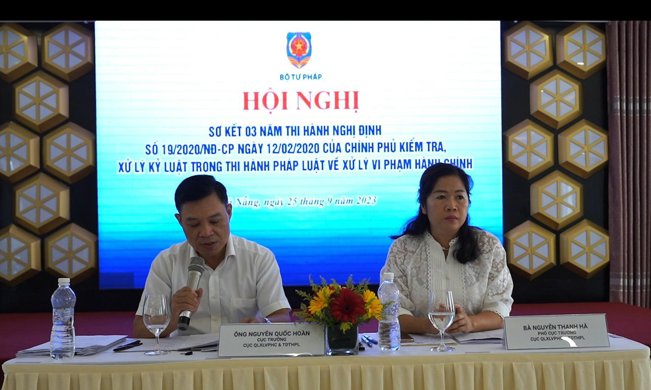 Ông Nguyễn Quốc Hoàn- Cục trưởng Cục Quản lý xử lý vi phạm hành chính và theo dõi thi hành pháp luật, Bộ Tư pháp và bà Nguyễn Thị Thanh Hà- Phó Cục trưởng, chủ trị Hội nghị. Đến tham dự còn có đại diện UBND, Sở Tư pháp, một số cơ quan chuyên môn của các tỉnh, thành phố trực thuộc Trung ương thuộc khu vực miền Trung, miền Nam, Nam Trung Bộ và Tây Nguyên cùng UBND các quận, huyện của TP. Đà Nẵng.