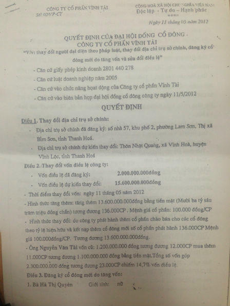 Trong nội dung biên bản và Quyết định của ĐHĐCĐ ngày 11/5/2012, chúng tôi quyết định về tăng vốn Điều lệ; Dự kiến thay đổi Cổ đông khi Công ty chuyển nhượng Cổ phần phát hành thêm; Thay đổi địa chỉ trụ sở chính và dự kiến sẽ thay đổi Người đại diện theo pháp luật của Công ty từ ông Nguyễn Văn Tài - Chủ tịch HĐQT Công ty cổ phần Vĩnh Tài sang ông Nguyễn Tuấn Hiệp (SN 1962, Nghĩa Tân, Cầu Giấy, Hà Nội) khi ông Hiệp là Cổ đông của Công ty. Sau đó, sẽ tiến hành thực hiện theo đúng quy định pháp luật và Điều lệ Công ty.