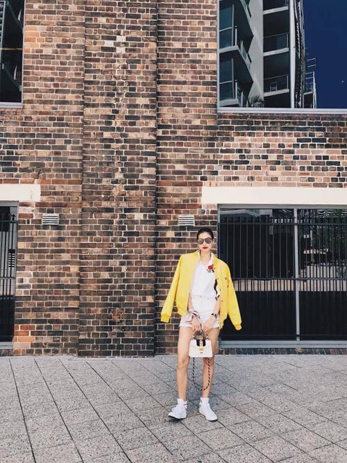 Hoa hậu Phạm Hương sành điệu không kém khi chọn cho mình mẫu áo hot trend để mix cùng short và áo khoác tông vàng rực rỡ. Phạm Hương mix đồ dạo phố mang hơi hướng năng động và trẻ trung.