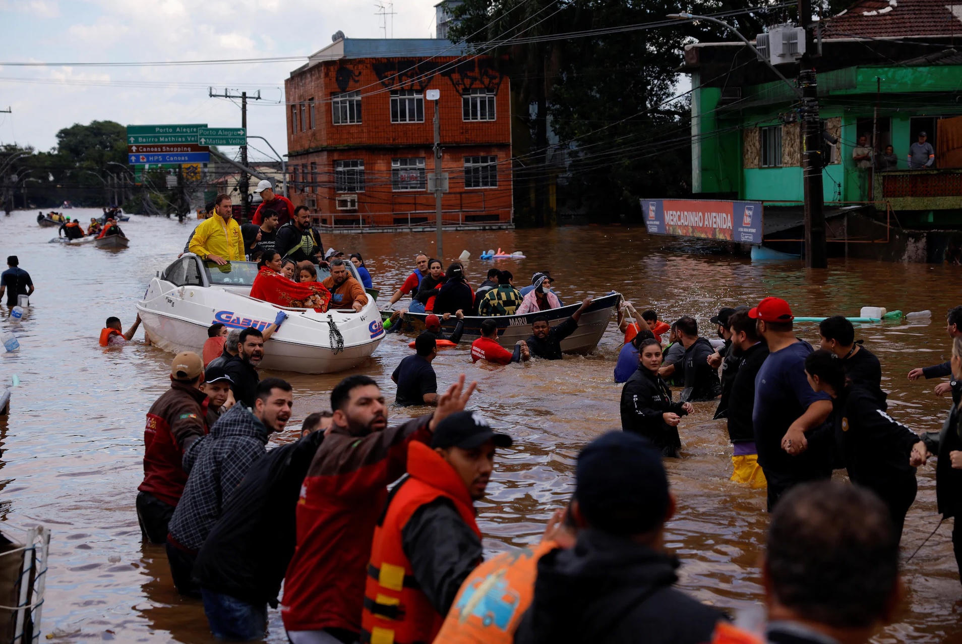 Tình nguyện viên tên Fabiano Saldanha cho biết, anh và 3 người bạn đã sử dụng mô tô nước để tìm kiếm những người mất tích, vận chuyển người. Từ ngày 3/5, họ đã giải cứu khoảng 50 người khỏi nước lũ trên các hòn đảo thuộc thành phố Porto Alegre. Ảnh: REUTERS/Renan Mattos.