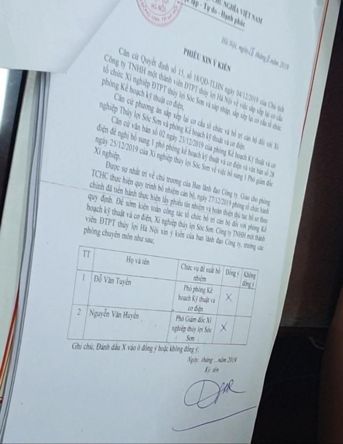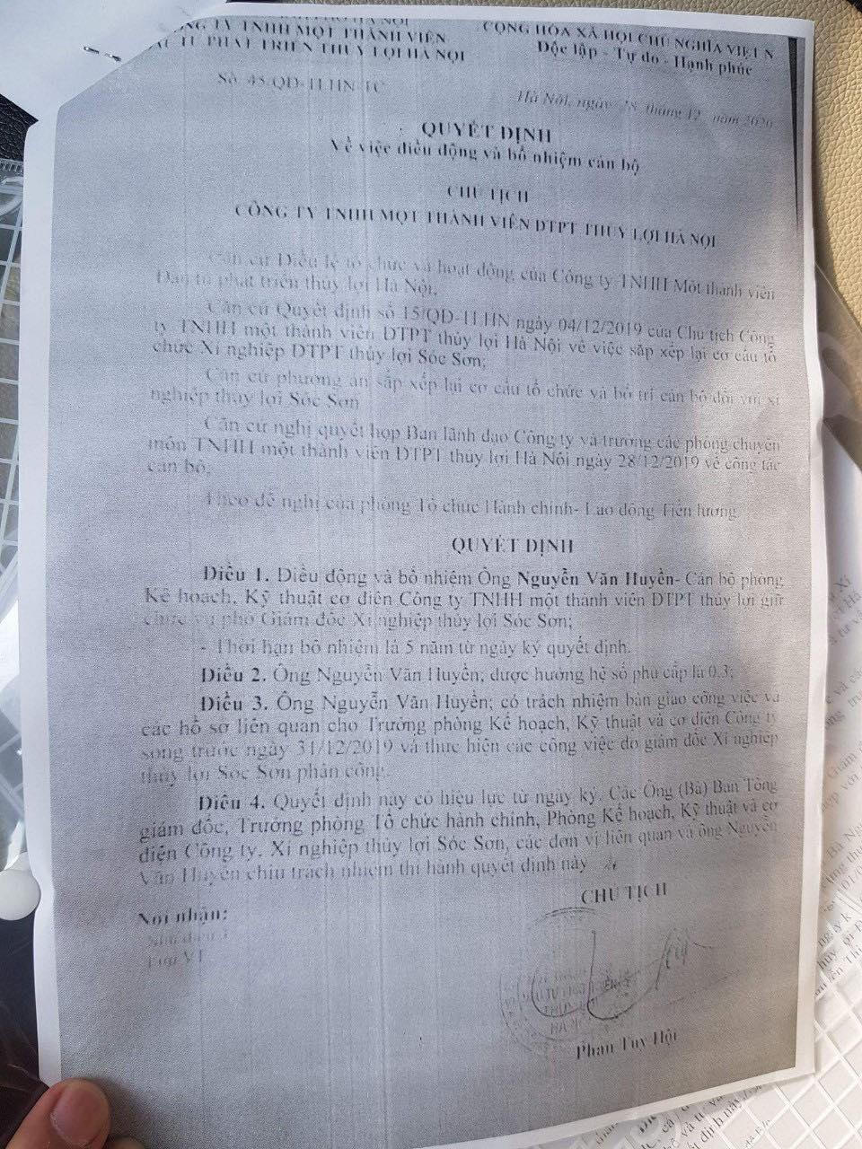 Nội dung đơn nêu rõ, ông Phan Tuy Hội ký quyết định bổ nhiệm “thần tốc” ông Nguyễn Văn Huyền là con trai ông Nguyễn Văn Hải – Phó Tổng Giám đốc phụ trách điều hành Công ty Thủy lợi Hà Nội làm phó Giám đốc Xí nghiệp thủy lợi Sóc Sơn (Xí nghiệp trực thuộc Công ty Thủy lợi Hà Nội). Trong khi, ông Huyền mới về Công ty công tác mới được một năm, chỉ là nhân viên phòng kế hoạch kỹ thuật.