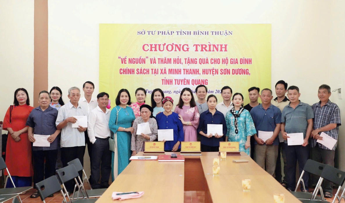 Sau lễ dâng hương, Đoàn Công tác Sở Tư pháp Bình Thuận tổ chức thăm hỏi và trao tặng 10 phần quà cho các gia đình chính sách tại xã Minh Thanh. Qua đây, thể hiện tinh thần trách nhiệm, gắn bó, nghĩa tình của cán bộ ngành Tư pháp Bình Thuận đối với nhân dân vùng căn cứ cách mạng và tình anh em kết nghĩa giữa hai tỉnh Bình Thuận – Tuyên Quang đã có từ hơn 65 năm qua.