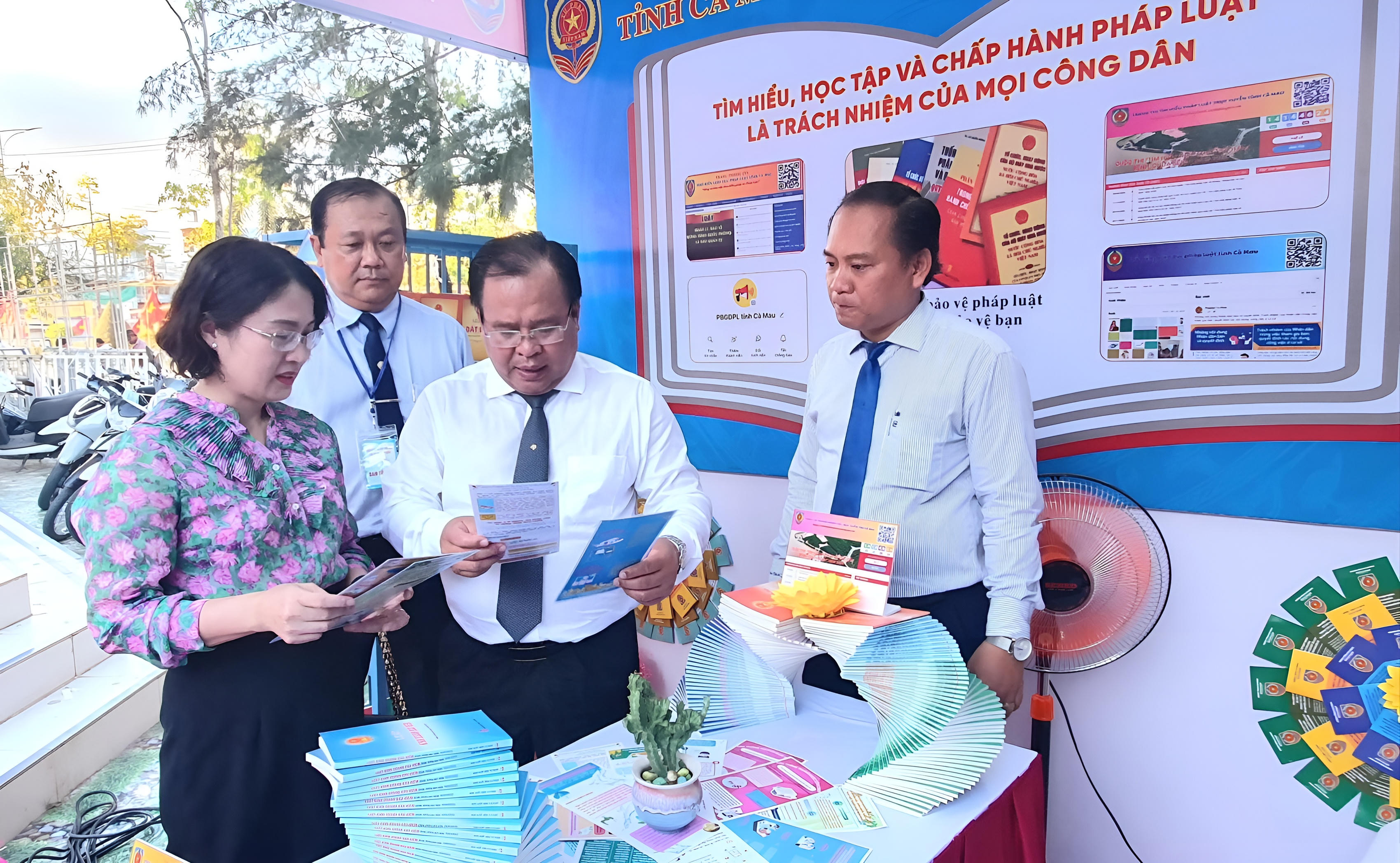 Ông Nguyễn Minh Luân - Phó Chủ tịch UBND tỉnh Cà Mau (thứ 2 từ trái sang) tham quan gian hàng trưng bày sách pháp luật của Sở Tư pháp. |