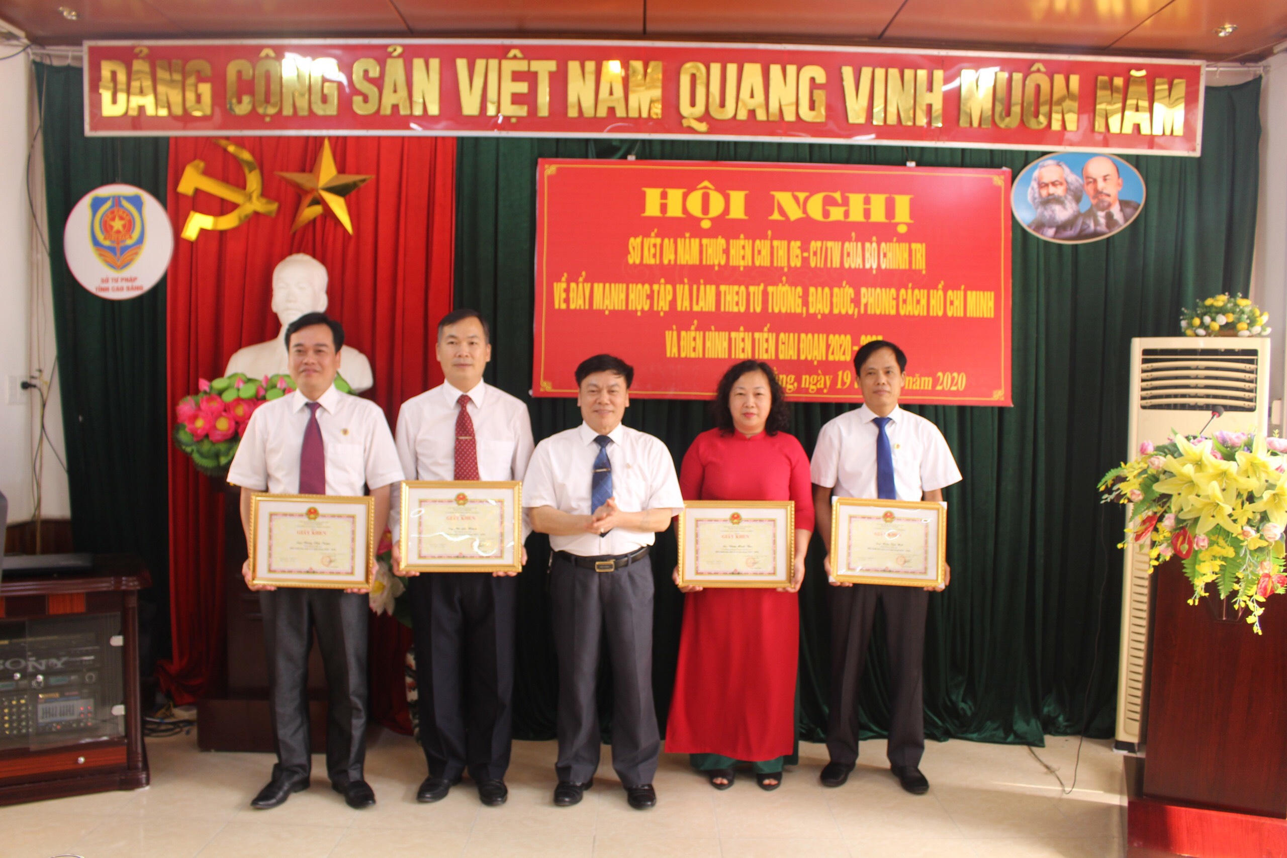 Năm 2020, Sở Tư pháp công nhận điển hình tiên tiến cho 02 tập thể, 07 cá nhân; tặng Giấy khen cho 02 tập thể, 05 cá nhân. Đảng ủy Sở Tư pháp biểu dương 16 cá nhân, khen thưởng 06 cá nhân học tập và làm theo tư tưởng, đạo đức, phong cách Hồ Chí Minh giai đoạn 2016- 2020.