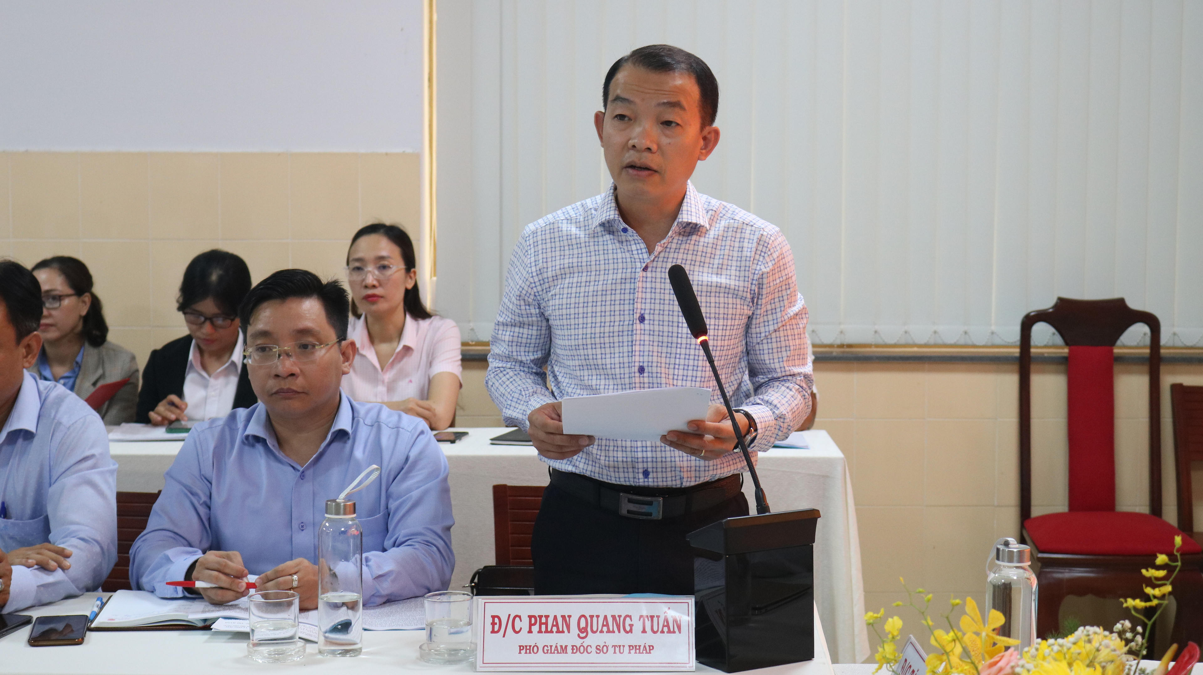 Phó Giám đốc Sở Tư pháp Phan Quang Tuấn báo cáo kết quả thực hiện công tác tư pháp 6 tháng đầu năm 2024. |