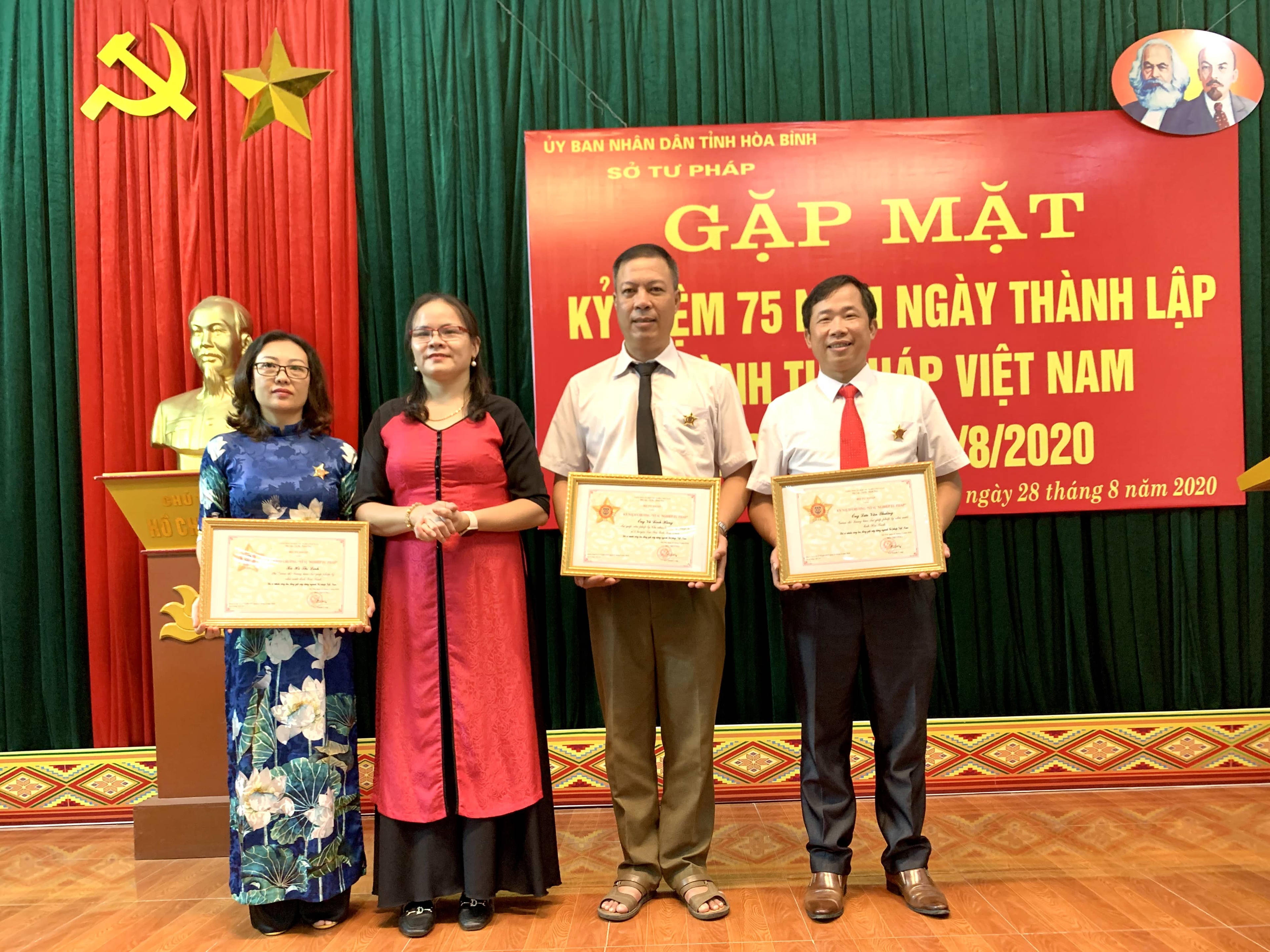 Nhân dịp này, để nhằm biểu dương những cá nhân là cán bộ, công chức, viên chức của Sở Tư pháp đã có những đóng góp xây dựng ngành Tư pháp Việt Nam và ngành Tư pháp tỉnh Hòa Bình ngày càng phát triển và vững mạnh. Thừa ủy quyền của Bộ trưởng Bộ Tư pháp, đồng chí Bùi Thị Thúy Bình, Bí thư Đảng ủy, Giám đốc Sở đã trao tặng Kỷ niệm chương “Vì sự nghiệp Tư pháp” cho 03 đồng chí: Lưu Văn Thường, Giám đốc Trung tâm Trợ giúp pháp lý Nhà nước tỉnh Hòa Bình; Hà Thị Linh, Phó Giám đốc Trung tâm Trợ giúp pháp lý Nhà nước tỉnh Hòa Bình; Vũ Đình Hùng, Trợ giúp viên pháp lý, Chi nhánh Trợ giúp pháp lý số 4 huyện Lạc Sơn, tỉnh Hòa Bình.