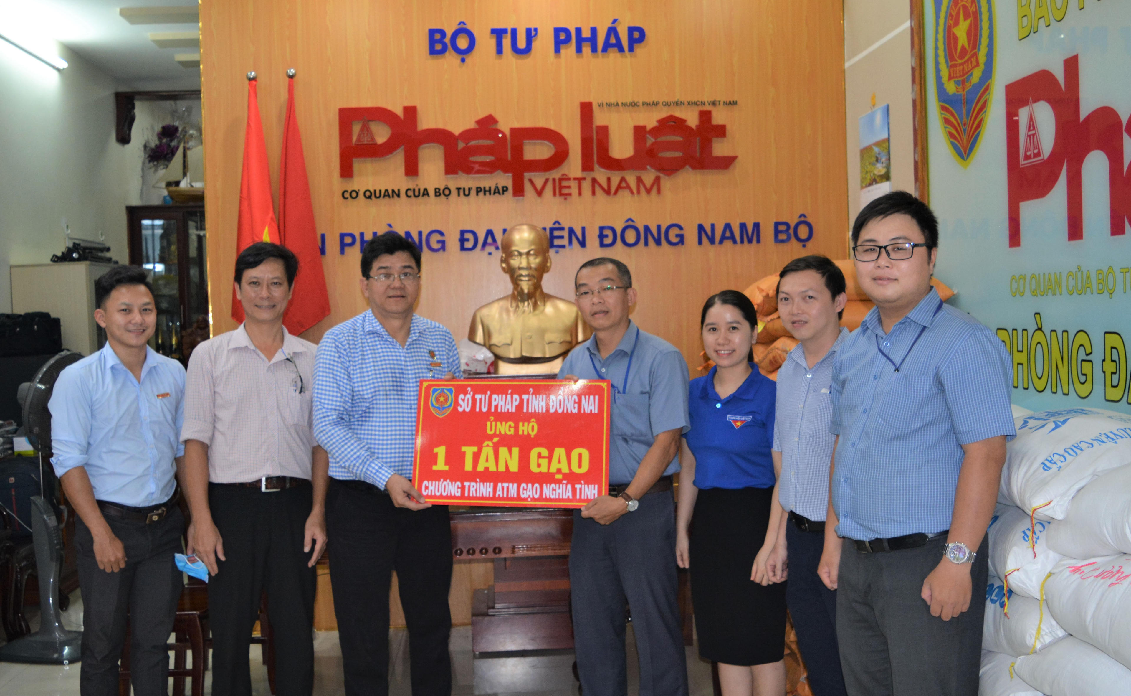 (PLVN) - Chiều ngày 24/4, Ban Giám đốc, Ban Chấp hành Công đoàn, Chi đoàn Sở Tư pháp tỉnh Đồng Nai do ông Phan Quang Tuấn - Phó giám đốc Sở Tư pháp tỉnh Đồng Nai làm trưởng đoàn đã đến ủng hộ 1 tấn gạo nhằm hỗ trợ các điểm ATM cấp phát gạo miễn phí do báo Pháp luật Việt Nam phối hợp cùng với Tỉnh đoàn Đồng Nai đang triển khai tại TP Biên Hòa và huyện Nhơn Trạch, tỉnh Đồng Nai.